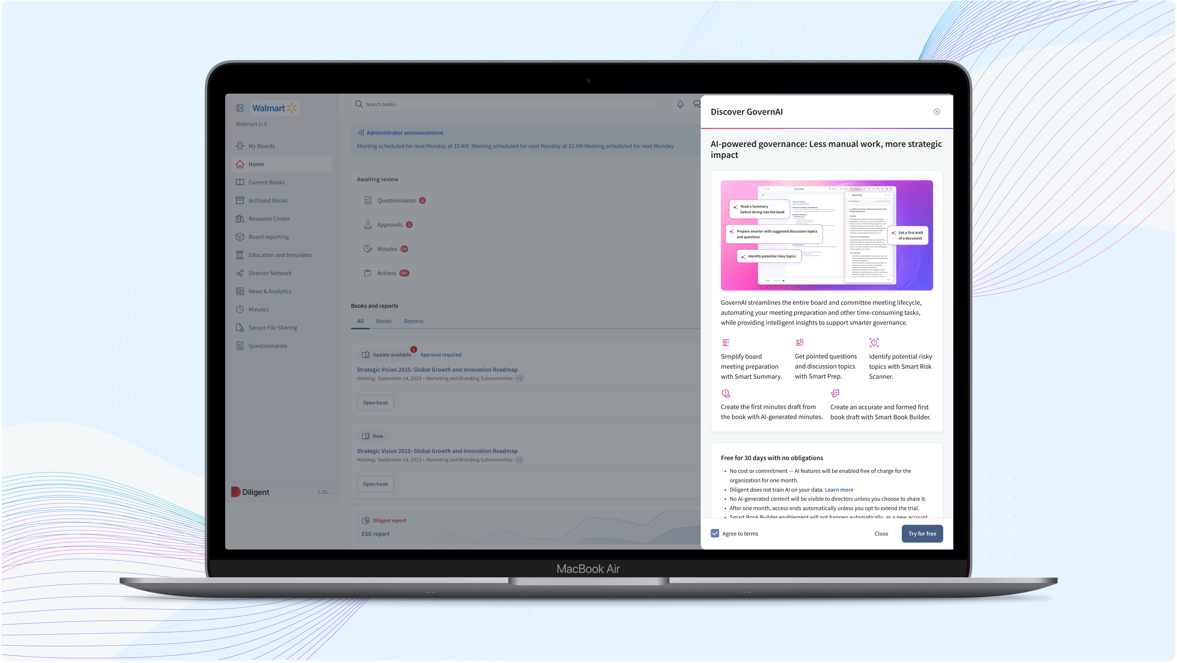 I led the design of the AI trial opt-in flow for Diligent Boards. AI features already existed in the product, but adoption was low. The goal was to let customers discover, try, and adopt AI directly in the product while respecting the sensitivity of regulated industries.